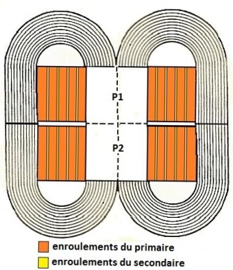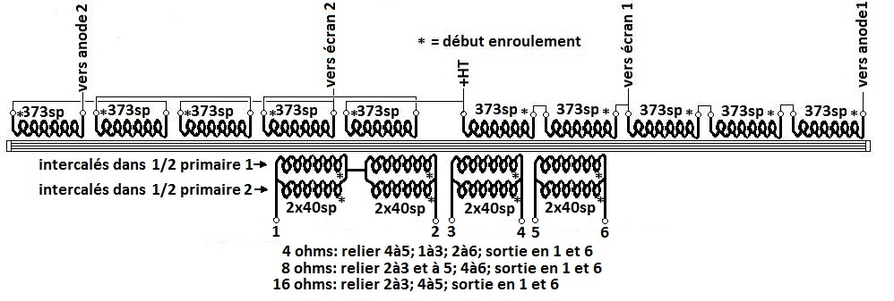 En pratique, on procèdera un peu différemment, en effet, d’une part, il faut limiter les inductances de fuite ( fuites de flux entre primaire et secondaire), et d’autre part, notre transfo étant prévu pour une fonctionnement en régime ultra-linéaire, il faut se remémorer que ce mode de fonctionnement revient à réaliser une contre réaction en tension par l’écran, or, si sur un tube on réalise une contre réaction en tension par l’écran, on réalise une réaction sur l’autre tube, ceci compromet grandement la stabilité de l’ampli; il conviendra donc, lors de l’exécution de notre transfo, de coupler au mieux le secondaire au primaire, pour limiter les inductances de fuite, tout en limitant le couplage entre les 2 demi-primaires, pour rendre l’étage de sortie stable.