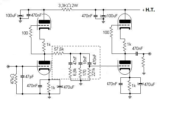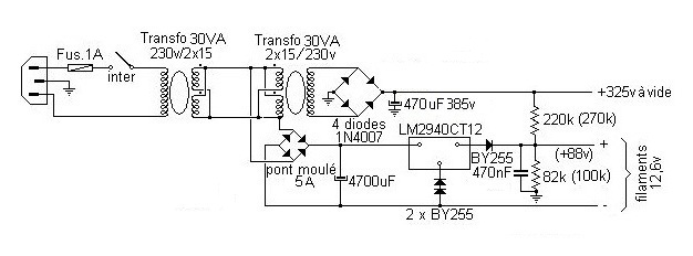 Les composants du correcteur (encadré en pointillé) sont à 1% Vous pourrez noter que le préampli possède des réglages graves et aiguës, je ne m’en suis servi que lors de la première mise sous tension, depuis lors, les boutons sont couverts de poussière… Si c’était à refaire, je ne les mettrais pas, comme l’écrivait M.Pierre Loyez dans son ouvrage « mes amplificateurs », lorsqu’on a un bon ampli, des bonnes enceintes, de bonnes sources (platine vynil et lecteur cd) et qu’on utilise des disques en bon état et bien enregistrés, les filtres anti rumble, anti scratch et autres réglages sont inutiles… Plus on rajoute de composants plus on a de sources de pannes. Le choix des tubes reste à votre inspiration, essayez toutes les combinaisons entre ECC81,82 et 83, et gardez ce qui vous convient le mieux. Je vous conseille quand même de mettre à l’entrée R.I.A.A. une ECC83 munie d’une grille cadre, par exemple une E83CC JJ. Evitez les tubes chinois sans pour autant verser dans les « gold lion » ou autre marque de luxe, qui ne fabriquent rien, ces tubes étant le résultat d’un tri de tubes pas chers, remarqués et vendus bien chers pour ce que c’est. Favorisez plutôt les constructeurs que les revendeurs. L’alimentation est classique,Les filaments sont alimentés en continu pour des raisons de bruit, et isolés de la masse pour la raison suivante: Les tubes de la série ECC81, 82, 83 etc., ont un isolement filament/cathode de l’ordre de 100V. Or, la cathode du tube supérieur pouvant être, dans les cas extrêmes, portée à la demi tension d’alimentation H.T., soit environ à 150/160V, il y a un risque de claquage de l’espace filament/cathode; la solution consiste à porter les filaments à une tension prélevée sur la H.T. destinée aux anodes par un diviseur résistif. De cette façon, on n’atteint jamais la tension de claquage. Exemple d’alim. :