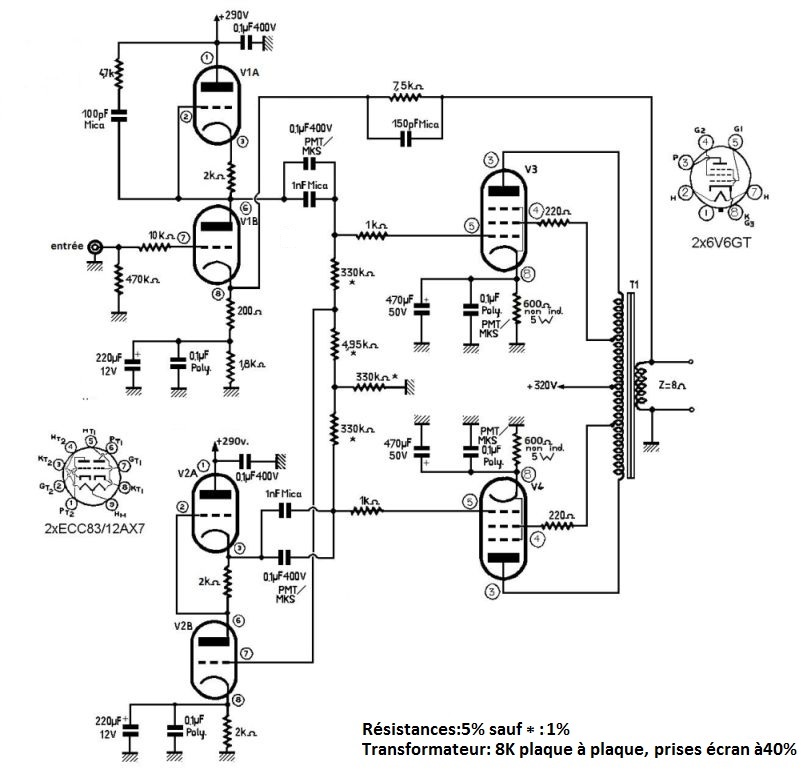 J’ai utilisé des transfos de sortie Supersonic de récupération sur une épave d’ampli récoltée dans une brocante pour une poignée de cerises, des TU101 Audax devraient faire également l’affaire, dans l’article d’origine du livre « mes amplificateurs », M. Loyez préconise des Millérioux, excellent choix, mais malheureusement rare et cher!