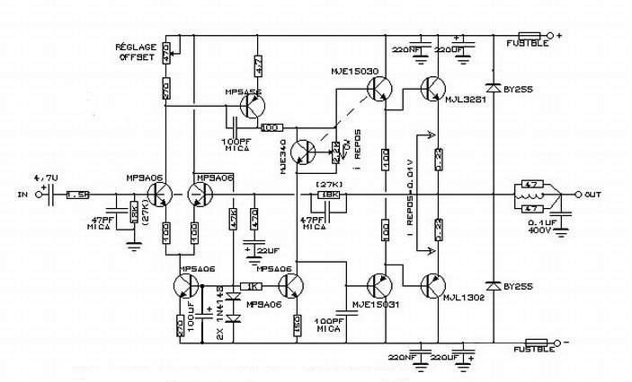 Le choix des transistors n’est pas anodin, les MJL3281 et MJL1302 sont très performants (15A., 200V., 200W. et un Hfe de 125 jusque 8A.), ils ont l’avantage d’être en boîtier TO264 (ce que certains appellent TO3P) ne nécessitant qu’un simple perçage du radiateur, leur prix est attractif ( 6€ pièce chez électronique diffusion). Les drivers MJE15030 et MJE15031 sont également intéressants (8A., 150V., 50W.) en TO220 (2,4€ et 2,1€ respectivement chez le même fournisseur). Les autres transistors coutent une misère.