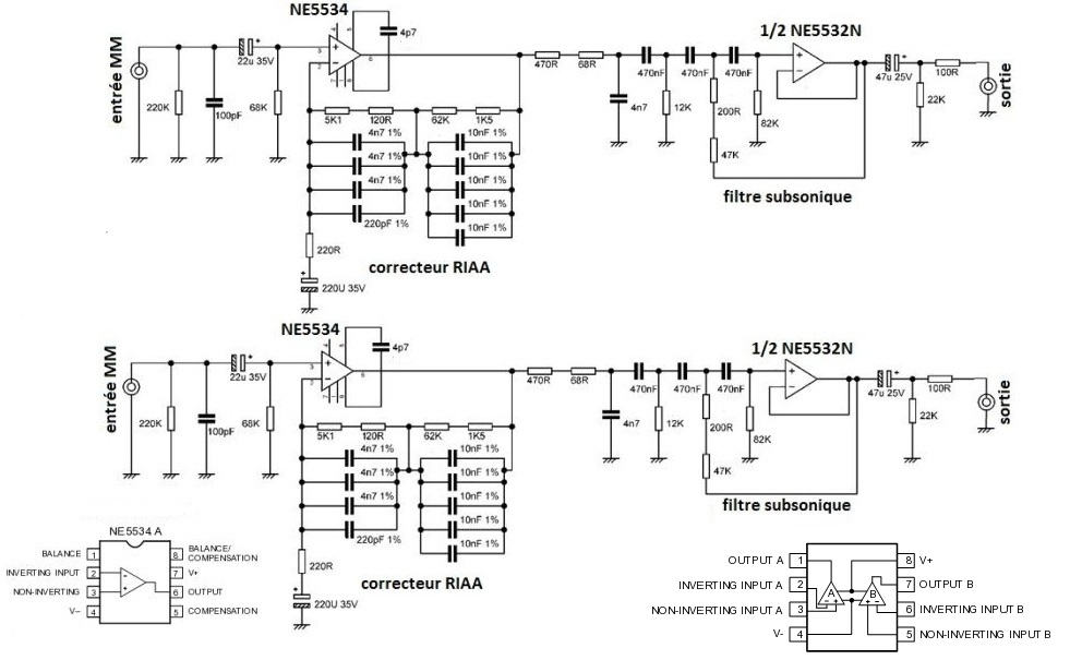 Le NE5534 d’entrée ne doit pas être remplacé par un NE5532, car le 5532 n’offre pas la possibilité de mettre un condensateur de compensation, le facteur de bruit s’en ressent, donc le 5534 n’est pas remplaçable sans dégradation des caractéristiques.La mise en œuvre de plusieurs condensateurs à 1% en parallèle améliore encore la précision, on trouve des styroflex à 1% chez Sélectronic pour des prix très raisonnables. Le filtre subsonique satisfait aux dispositions de l’amendement IEC du standard RIAA. Ce montage étant destiné à remplacer l’étage d’entrée phono du Quad 34, il convient alors de modifier le Quad 34 de la façon suivante: La carte enfichable du Quad 34 ne sert qu’à amplifier le signal phono et le circuit composé d’IC7 et IC8 réalise la correction RIAA, la commutation de l’entrée phono par IC22 à travers C27 et C29. Pour utiliser un étage de correction phono externe, il faut retirer C26 et C28 (15nF), ainsi que C27 et C29 (470nF), remplacer R41 et R43 (750 ohms) par des résistances de 18Kohms, et remplacer R42 et R44 (39kohms) par des résistances de 82kohms ; souder un fil volant directement depuis le connecteur de l’entrée phono jusqu’à R41 d’une part et depuis l’autre connecteur d’entrée et R43 d’autre part. L’impédance d’entrée obtenue est de 100Kohms ; C27 et C29 servent à bloquer toute composante continue et peuvent être retiré dans le cas de notre correcteur RIAA externe, le continu étant bloqué par les condensateurs de sortie de 47uF. Si vous ne désirez pas réutiliser la configuration d’origine, vous pouvez démonter tous les composants de la carte phono d’origine ainsi que IC7 et IC8 avec tous leurs composants associés une alimentation + et – 17V. alimente ce petit montage
